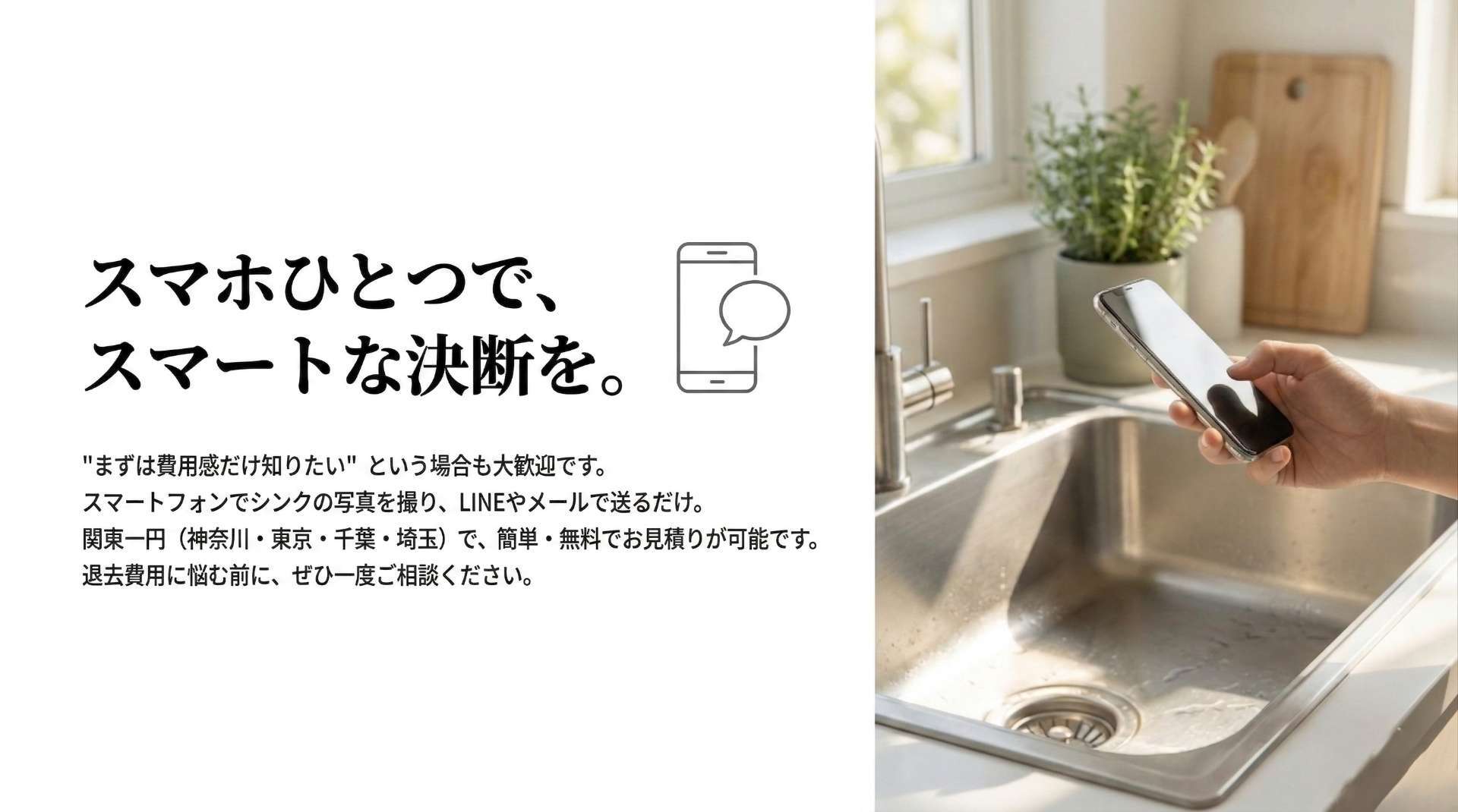 アールペアでは、関東一円(神奈川・東京・千葉・埼玉)で法人様からのご依頼を承っております。「まずは費用感だけ知りたい」という場合も大歓迎です。スマートフォンでシンクの写真を撮り、LINEやメールで送るだけで、簡単・無料でお見積りが可能です。