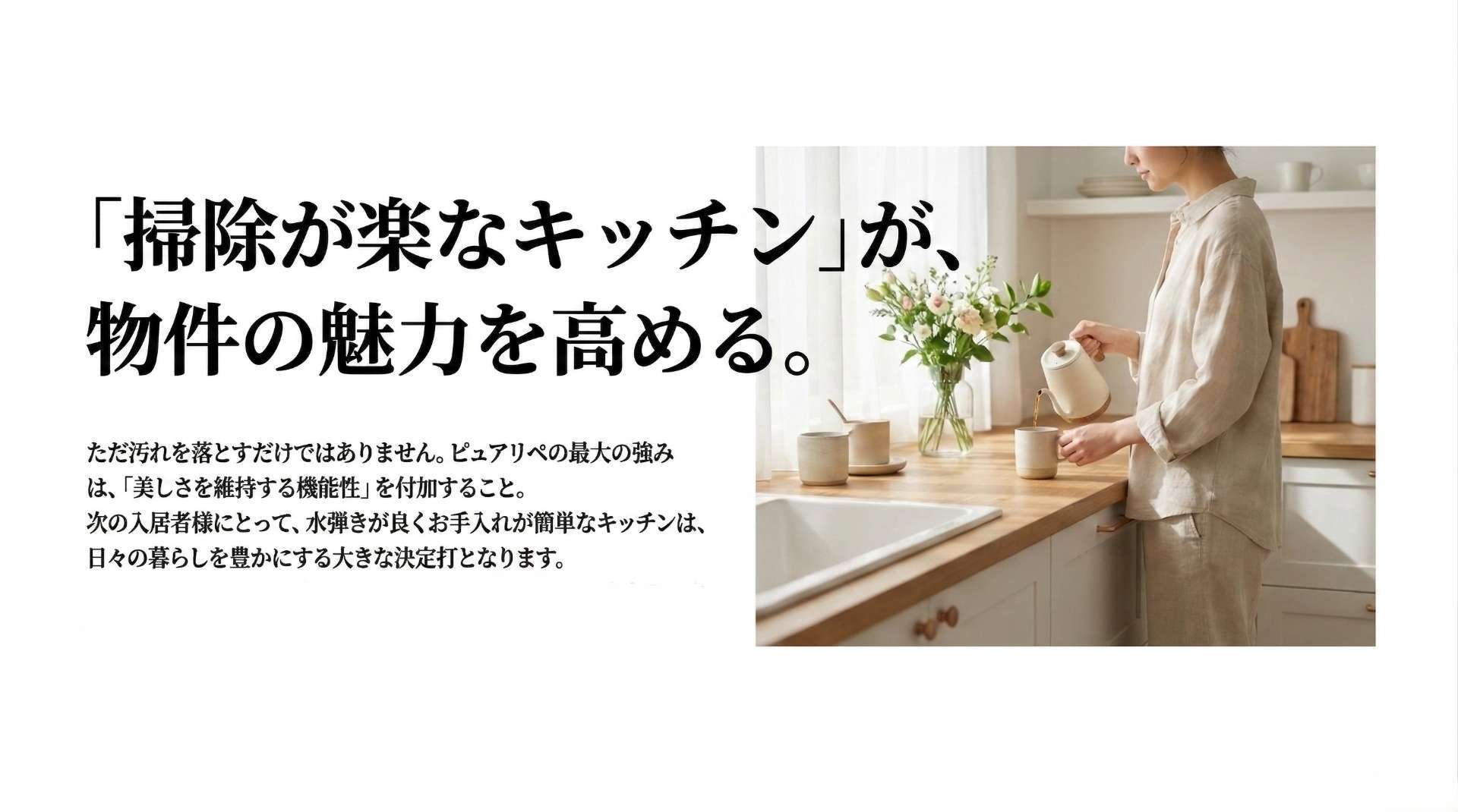 このように、「ただ汚れを落とす」だけでなく「美しさを維持する機能性を付加する」のがピュアリペの強みです。次の入居者様にも「水弾きが良くてお掃除が楽なキッチン」として喜ばれるため、物件の魅力アップに直結します。