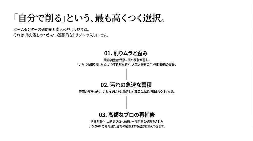 結局、「DIYでやってみたけれど見た目が悪化し、慌ててプロに再依頼する」というケースが後を絶ちません。一度粗悪な処理をされたシンクを直すための「再補修」は、通常の補修よりも手間がかかるため、最初からプロに頼むより遥かに高くついてしまいます。