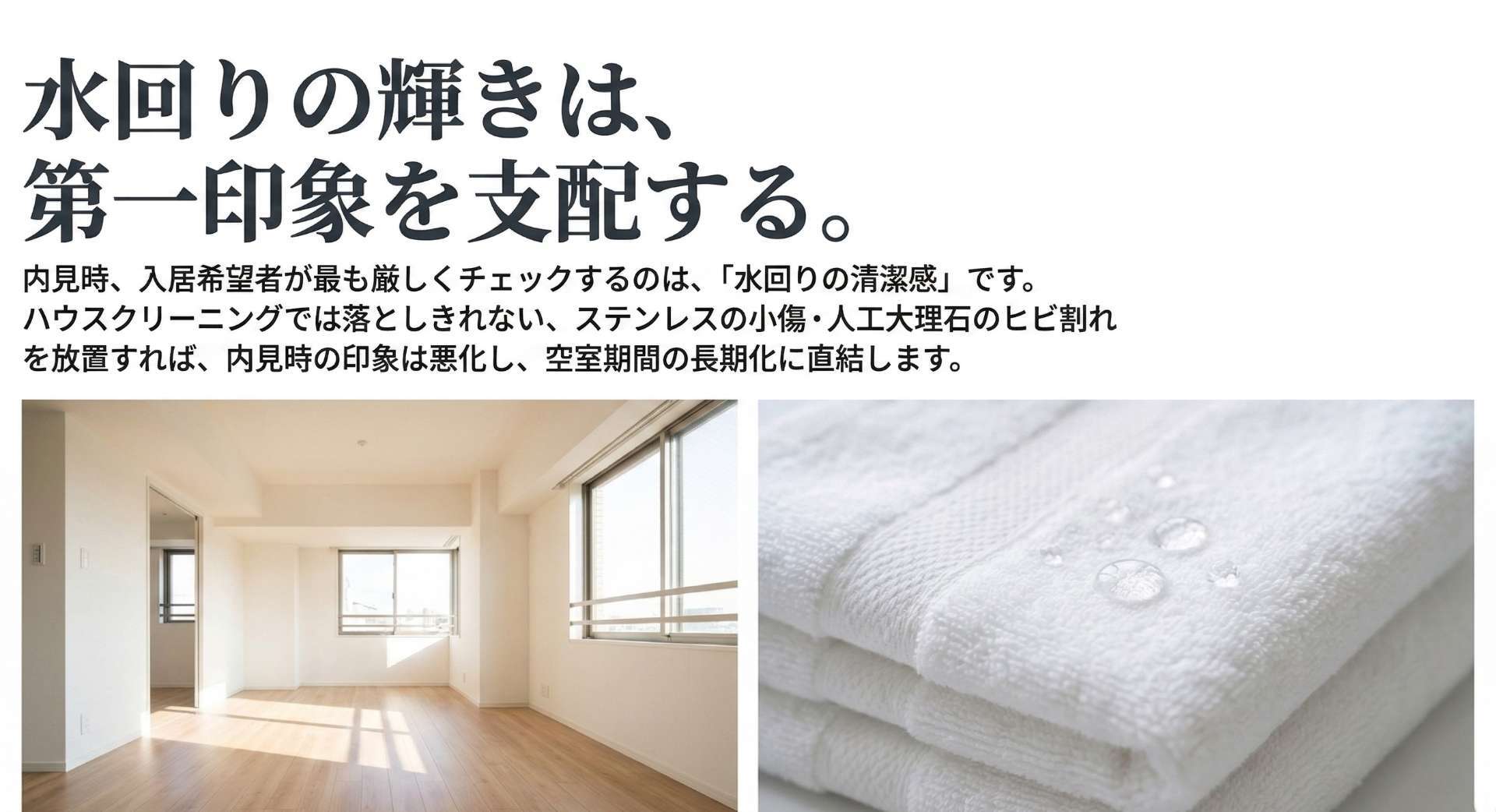 これらの症状は、一般的なハウスクリーニングでは決して落としきれません。「まだ使えるけれど、見た目が古くて汚い」という状態をそのままにしておけば、不動産価値を下げ、入居率の低下を招いてしまうでしょう。